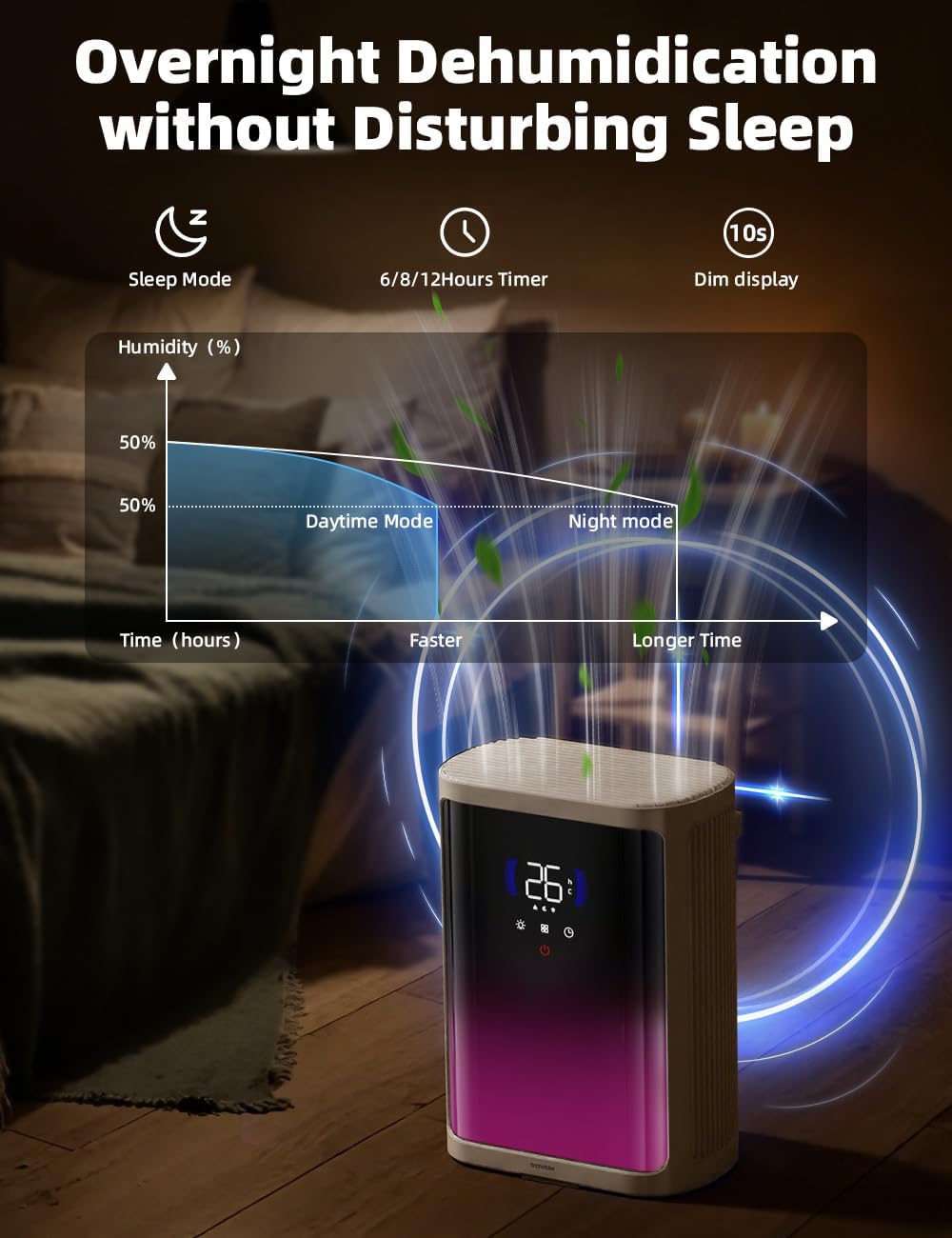 【Funcionamiento Ultra Silencioso】Este deshumidificador inteligente ofrece dos modos para su comodidad durante todo el día. El modo diurno proporciona una potente deshumidificación durante sus horas activas, mientras que el modo nocturno reduce la velocidad del ventilador y el ruido por debajo de 30 dB. La pantalla se atenúa automáticamente, creando una suave atmósfera…