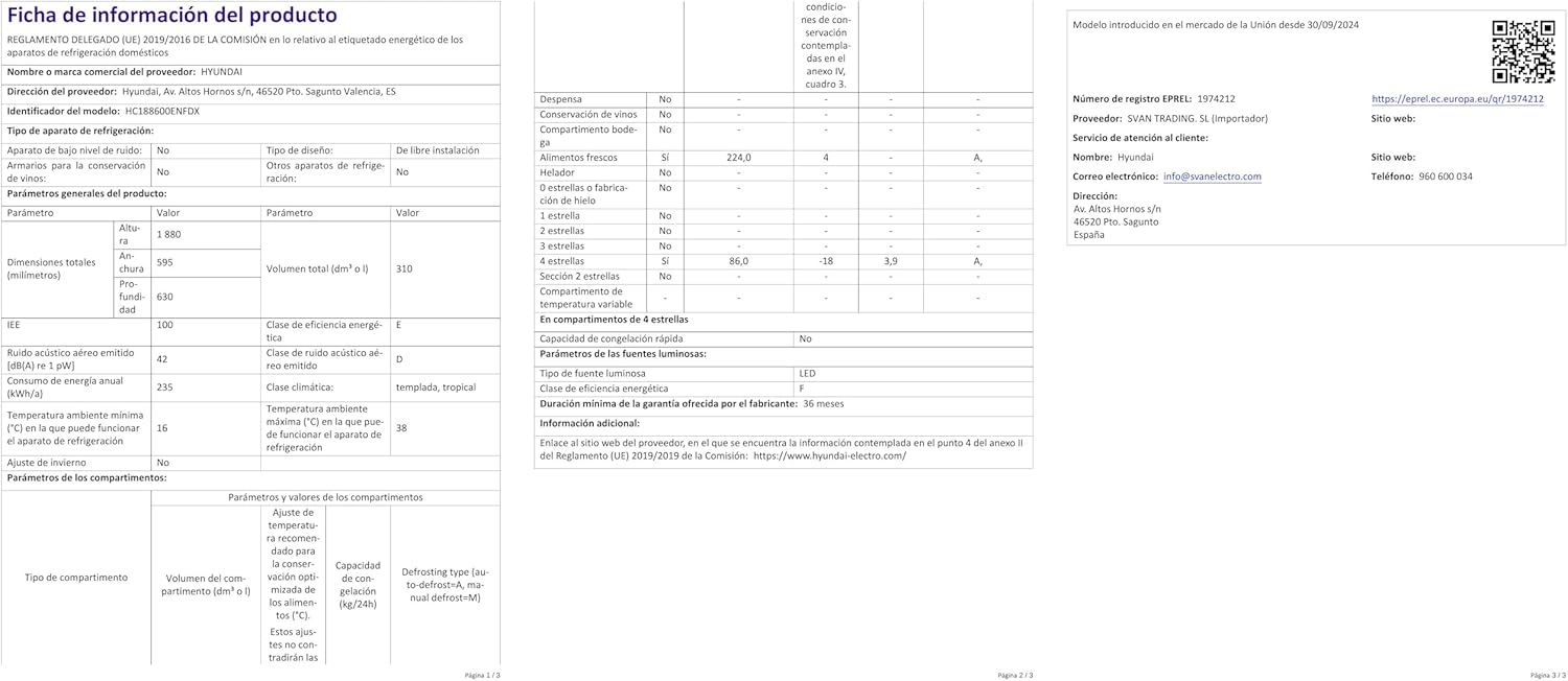 Frigorífico Frigorífico Combinado Hyundai HC188600ENFDX con tecnología No Frost, con motor universal y gas R600a. Eficiencia energética E y nivel sonoro máximo de 42 dB. Estético acero inoxidable con 2 puertas reversibles con tipo apertura y sistema Zero Clearance 90. Iluminación interior LED.