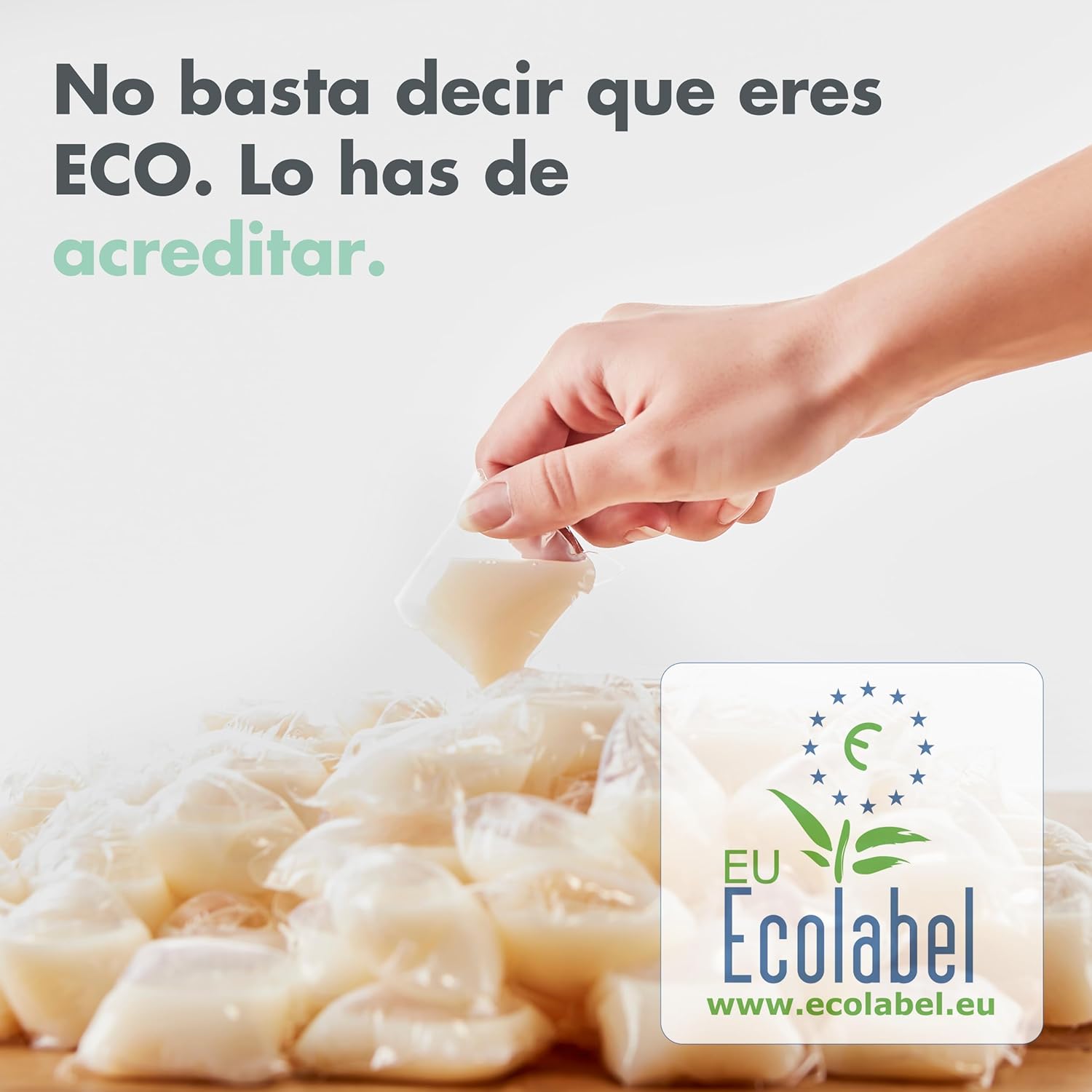 que muestra cápsulas de detergente ecológicas con características etiquetadas en español: pH neutro, vegano, fragancia floral, certificación Ecolabel y eficaz en agua fríaque muestra cápsulas de detergente ecológicas con características etiquetadas en español: pH neutro, vegano, fragancia floral, certificación Ecolabel y eficaz en agua fría
